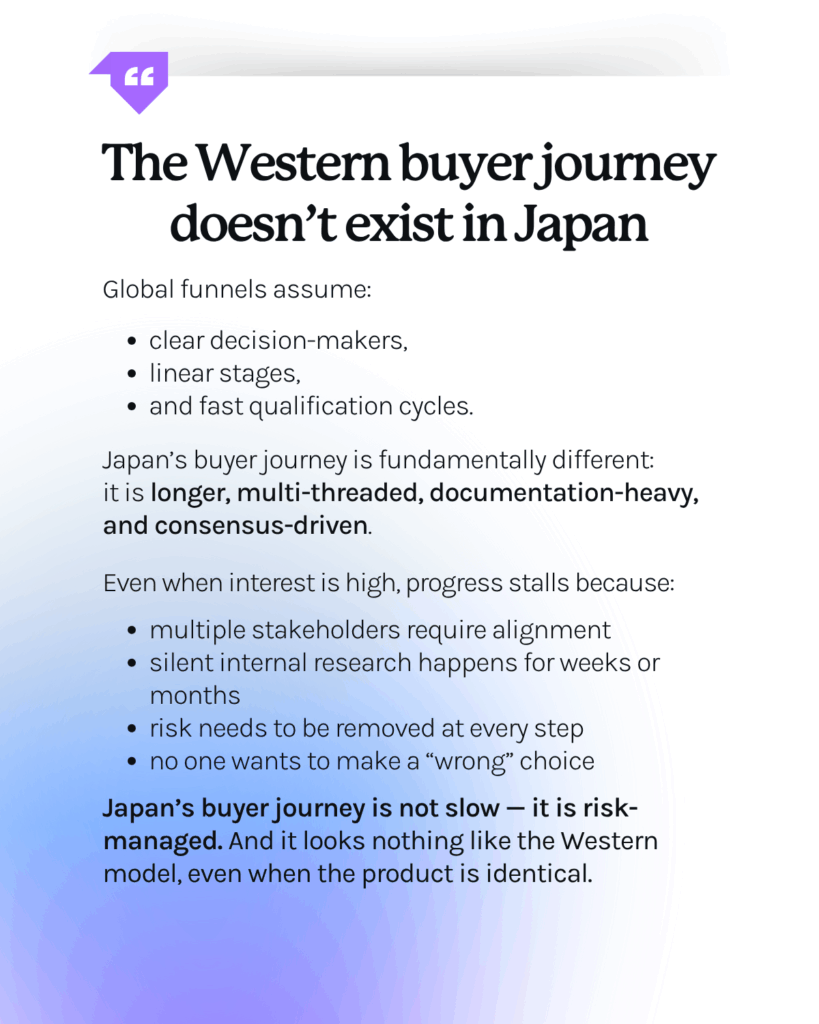 Japan’s buyer journey is longer, multi-threaded, documentation-heavy, and consensus-driven.